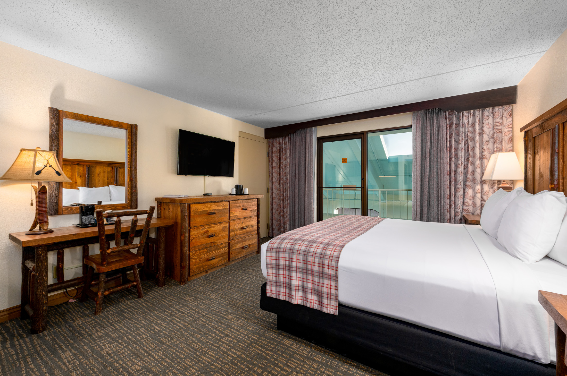 Relax in our Jetted Tub King room at Lodge of the Ozarks. This room includes a spacious bathroom with a jetted tub and shower combination. It also features a patio door leading to a balcony overlooking the indoor pool. Additional in‑room amenities include an accent chair, a desk with chair, free Wi‑Fi, a 55” HDTV, a mini‑refrigerator, microwave, in‑room coffee, hairdryer, iron, and ironing board. With 325 ft² of space, you can expect a comfortable and enjoyable stay. All rooms are non-smoking.