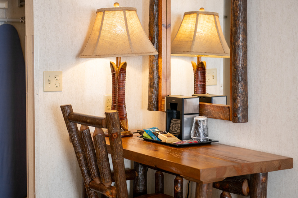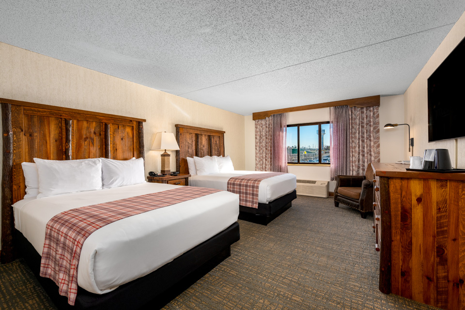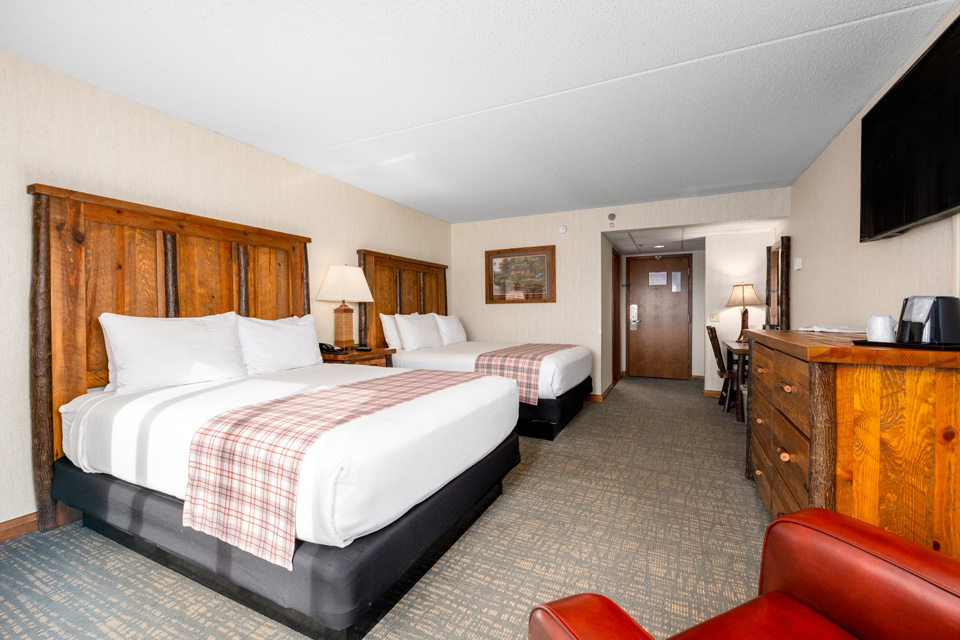 Relax in a standard Double Queen room at Lodge of the Ozarks. This room features an accent chair, desk with chair, free Wi-Fi, a 55” HDTV, a mini refrigerator, microwave, in-room coffee, hairdryer, iron, and ironing board. Most standard Double Queen bathrooms offer a shower only. Contact the hotel directly for availability of a tub/shower combination. With 325 ft2 of space, you can expect a comfortable and enjoyable stay. All rooms are non-smoking.