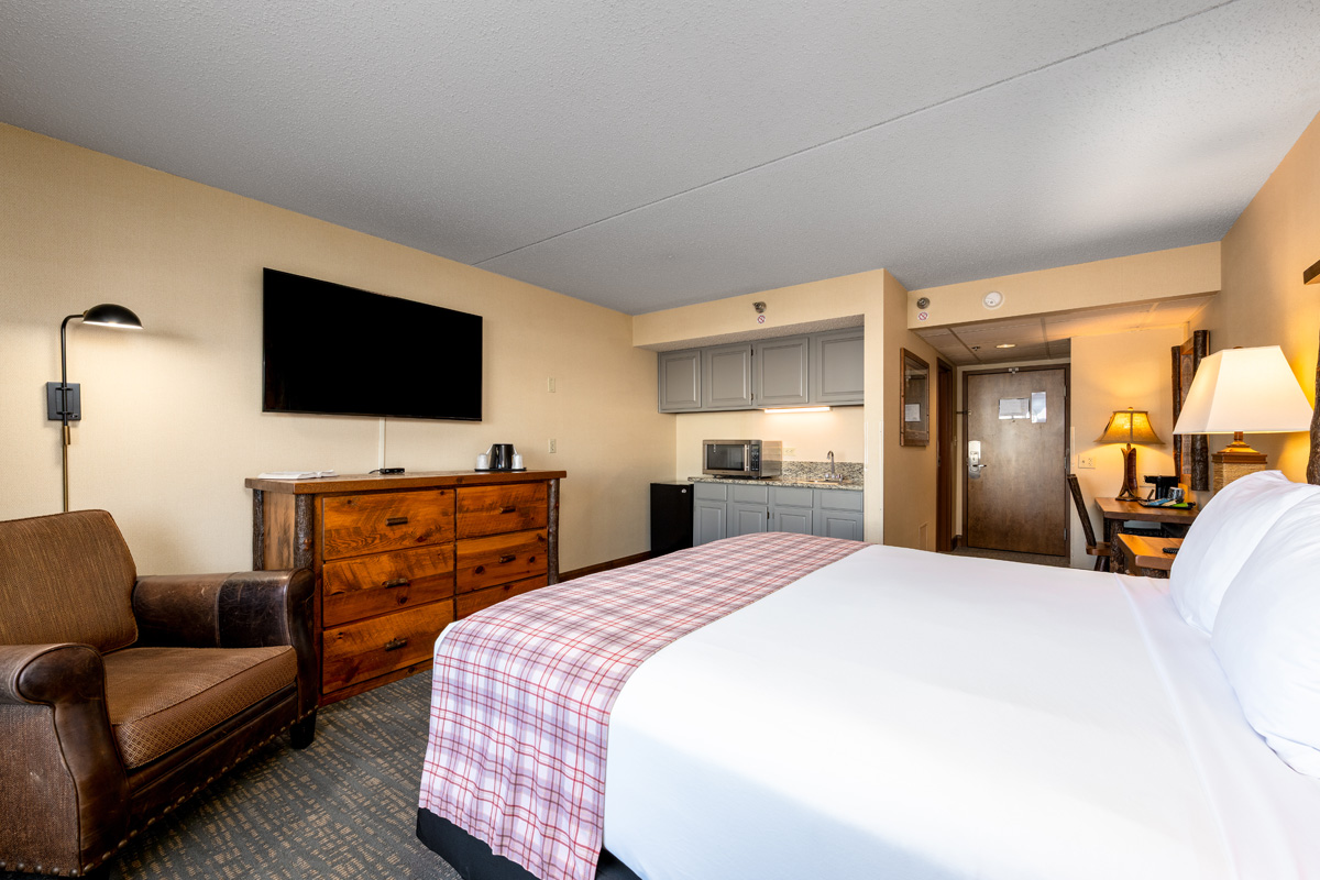 Relax in a Jetted Tub King room at Lodge of the Ozarks, featuring a spacious bathroom with a jetted tub and shower combination. Additional in-room amenities include an accent chair, desk with chair, free Wi-Fi, a 55” HDTV, a mini refrigerator, microwave, in-room coffee, hairdryer, iron, and ironing board. With a room size of 325ft2, you can expect a comfortable and enjoyable stay. All rooms are non-smoking.
