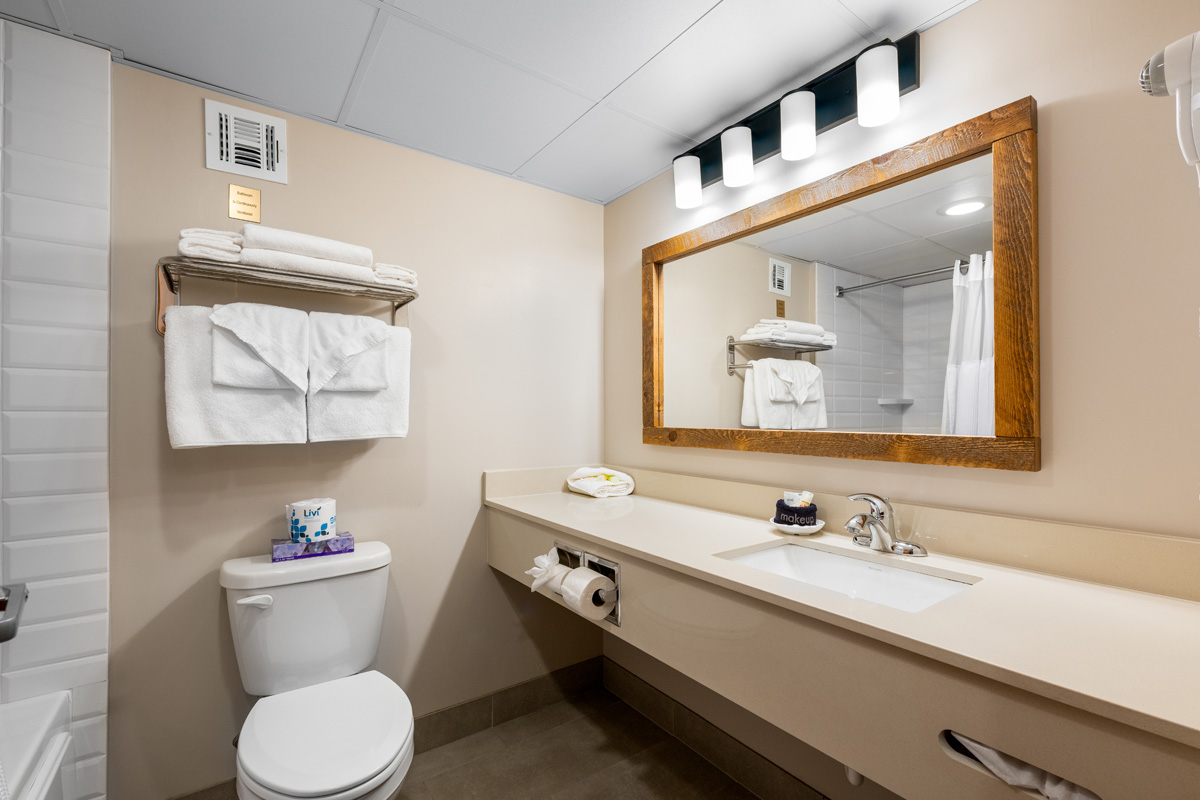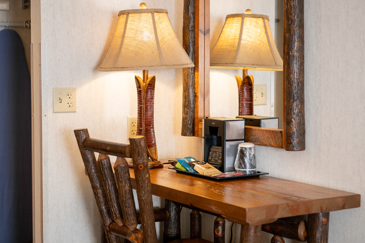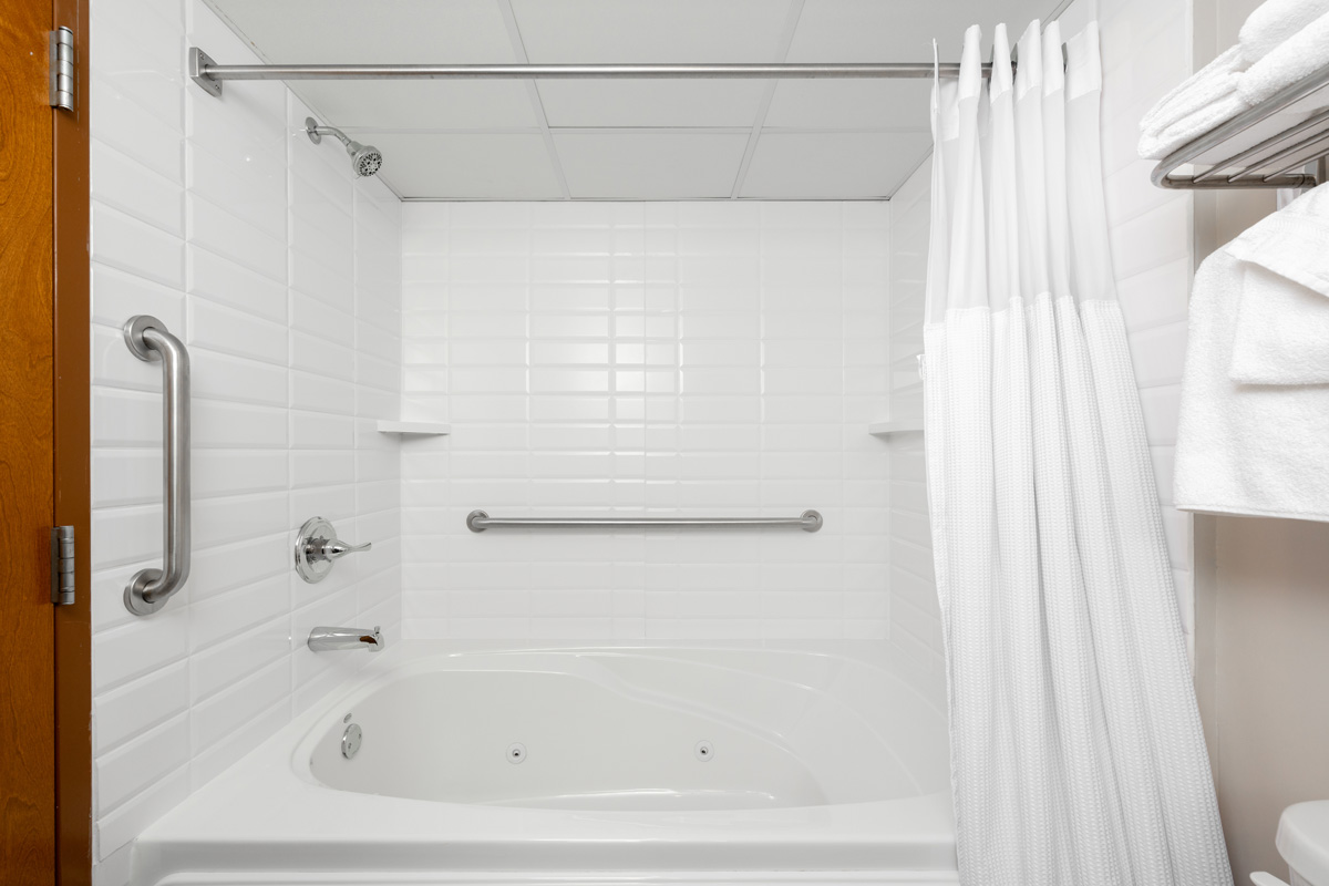 Relax in a Jetted Tub King room at Lodge of the Ozarks, featuring a spacious bathroom with a jetted tub and shower combination. Additional in-room amenities include an accent chair, desk with chair, free Wi-Fi, a 55” HDTV, a mini refrigerator, microwave, in-room coffee, hairdryer, iron, and ironing board. With a room size of 325ft2, you can expect a comfortable and enjoyable stay. All rooms are non-smoking.