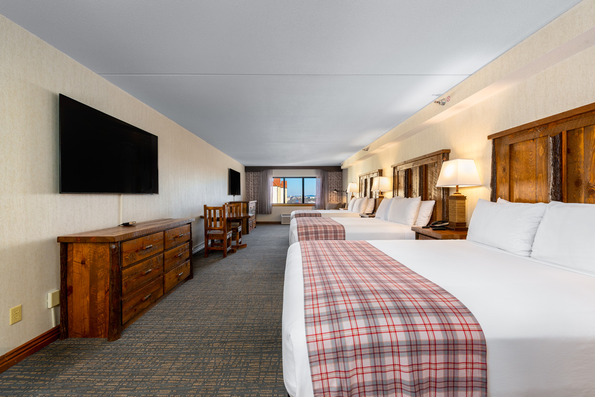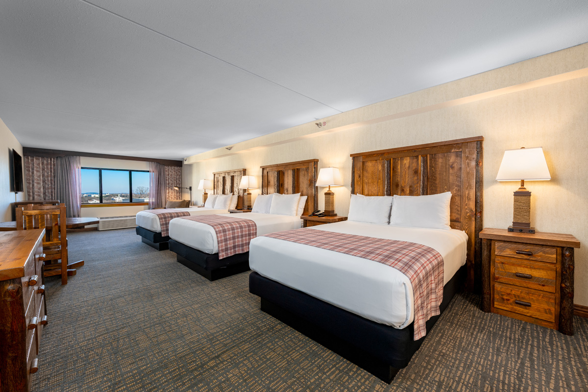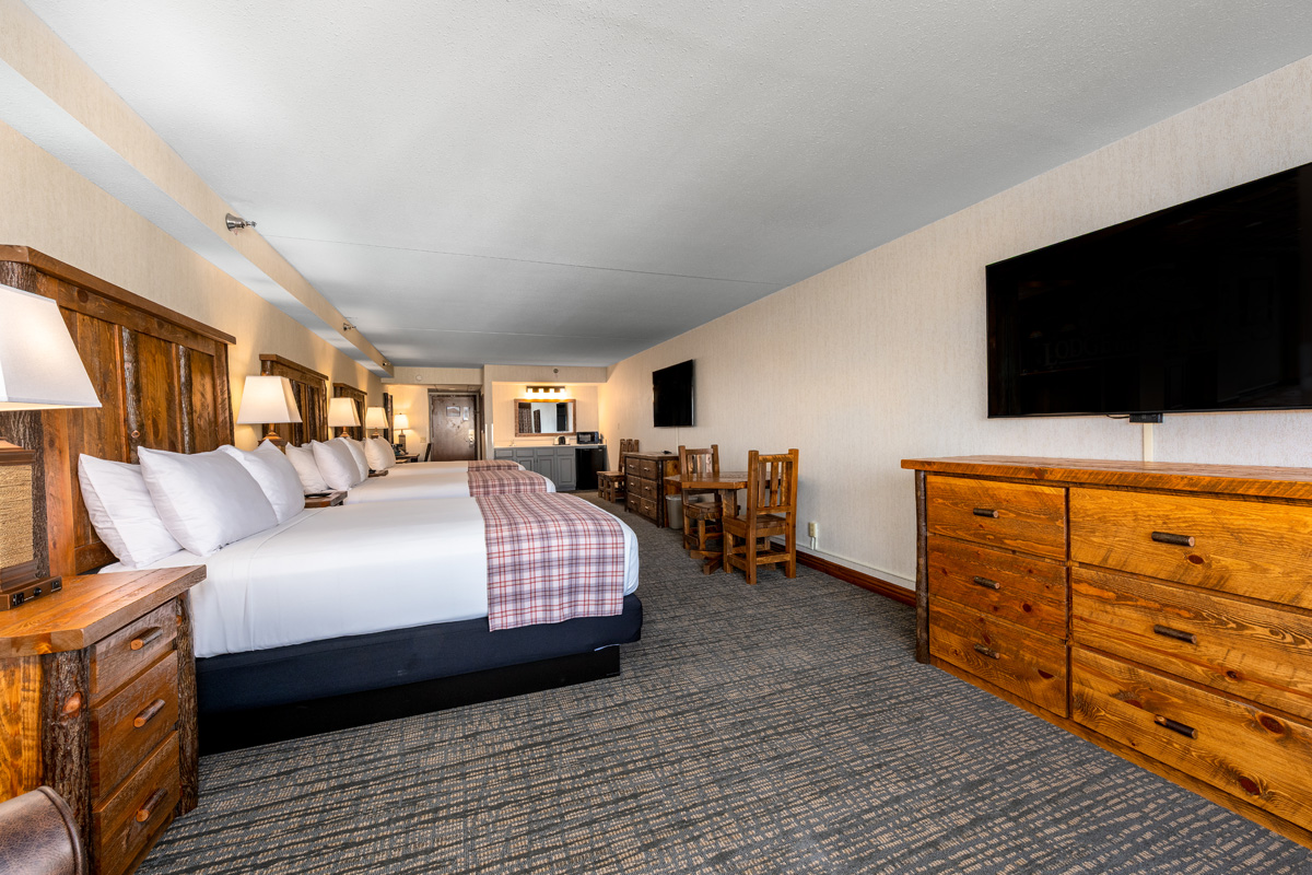 Relax in a Triple Queen room at Lodge of the Ozarks. This unique room features a table with chairs, an accent chair, desk with chair, free Wi-Fi, a 55” HDTV, a mini refrigerator, microwave, in-room coffee, hairdryer, iron, and ironing board. The Triple Queen room features one bathroom with a shower only. With 598 ft2 of space, you can expect a comfortable and enjoyable stay. All rooms are non-smoking.